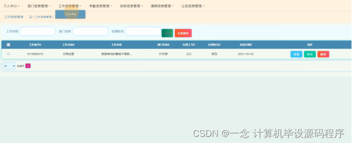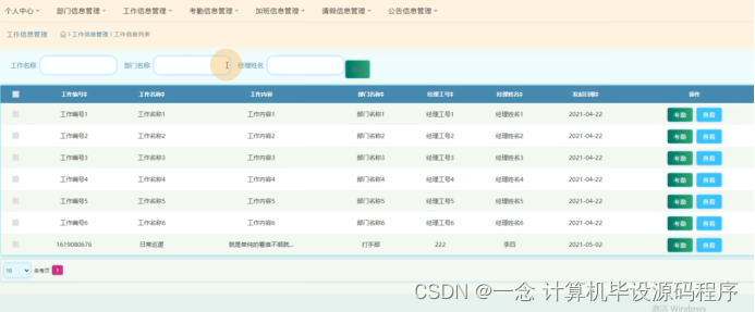 工作信息管理,在工作信息管理页面可以查看工作编号、工作名称、工作内容、部门名称、经理工号、经理姓名、发起日期等信息,并可根据需要进行查看、考勤等操作,如图5-17所示。