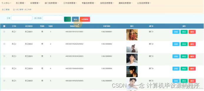 员工管理,在员工管理页面可以查看工号、员工姓名、性别、年龄、身份证号码、手机号码、相片、部门等信息,并可根据需要进行查看,修改或删除等操作,如图5-3所示。