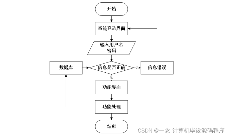 用户打开并进入系统后,会先显示登录界面,输入正确的用户名和密码,系统自动检测信息,若信息无误,则用户会进入系统功能界面,进行操作,否则会提示错误无法登录,操作流程如图3-3所示。