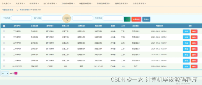 考勤信息管理,在考勤信息管理页面可以查看工作编号、工作名称、部门名称、经理工号、经理姓名、发起日期、状态、工号、员工姓名、考勤时间等信息,并可根据需要进行查看、删除等操作,如图5-7所示。