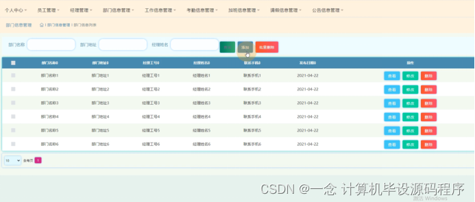 部门信息管理,在部门信息管理页面可以查看部门名称、部门地址、经理工号、经理姓名、联系手机、发布日期等信息,并可根据需要进行查看,修改或删除等操作,如图5-5所示。