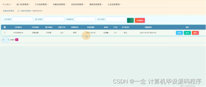 考勤信息管理,在考勤信息管理页面可以查看工作编号、工作名称、部门名称、经理工号、经理姓名、发起日期、状态、工号、员工姓名、考勤时间等信息,并可根据需要进行查看、修改或删除等操作,如图5-18所示。