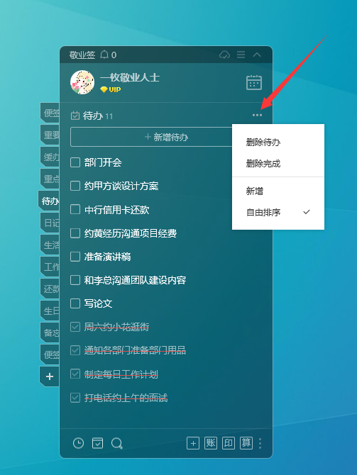 敬业签待办记录的内容会自动同步至云服务器,使用同一账号,便能在多个平台实现内容的同步查看。以Windows电脑端为例,在待办分类下点击顶部“+新增待办”创建新的待办事项,记录的事项会以列表形式进行展示,同时在右上角点击三点处,选择“自由排序”,还能通过拖拽方式进行自由顺序。