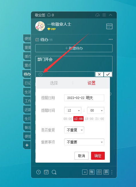 双击待办内容,点击内容下的钟表图标,可设置待办事项的单次提醒、按天/周/月/年的周期性重复提醒、重要事项间隔提醒,以及公农历的提醒等等。通过此种方式,便能将任务合理制定完成时间,防止拖延造成任务的堆积。
