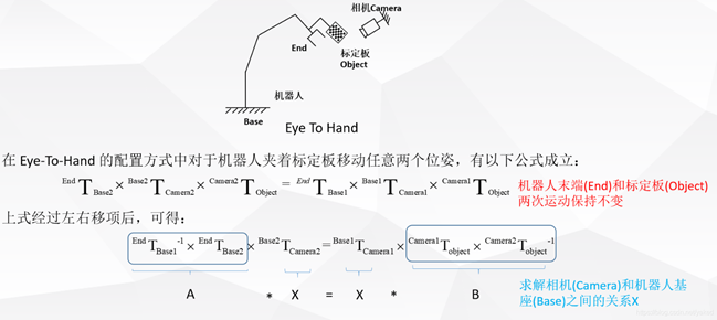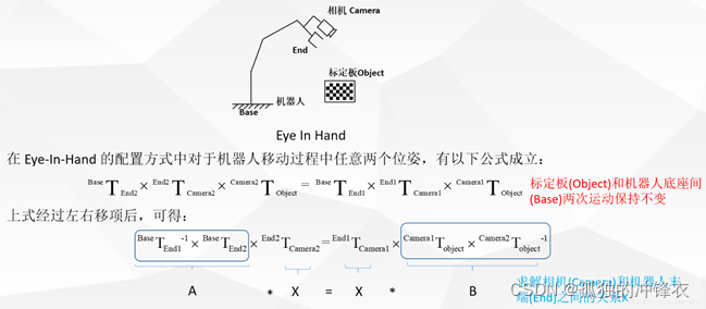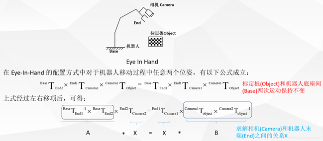 1. eye in hand,这种关系下,两次运动,机器人底座和标定板的关系始终不变。求解的量为相机和机器人末端坐标系的位姿关系。