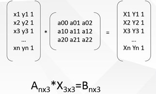 相机坐标和机器人坐标写成齐次的形式,投影矩阵X是一个3x3的矩阵我们需要6组对应点来求解最小配置解。利用奇异值分解SVD来求取。