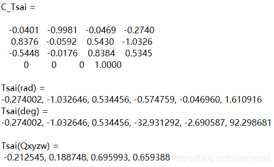 clear;close all;clc;% Robot pose in Quatenion xyzwJacoCartesianPose = importdata('E:\\Matlab_work\\handeye\\yake_handeye\\2017.08.29Kinova_pose_all_8_1.txt');[m,n] = size(JacoCartesianPose); % 8* 7A = cell(1,m); % 1*8for i = 1: mrobotHtool_qua = Quaternion([ JacoCartesianPose(i, 7), JacoCartesianPose(i, 4), JacoCartesianPose(i, 5) , JacoCartesianPose(i, 6)]) ;A{1,i} = transl(JacoCartesianPose(i, 1), JacoCartesianPose(i, 2), JacoCartesianPose(i, 3)) * robotHtool_qua.T;end% Pattern Pose(Homogeneous) stored in cell B.patternInCamPose = importdata('E:\\Matlab_work\\handeye\\yake_handeye\\2017.08.29Pattern_pose_all_8_1.txt');[melem,nelem] = size(patternInCamPose); % 8*7B=cell(1,melem);for x=1: melemcamHmarker_qua = Quaternion([ patternInCamPose(x, 7) , patternInCamPose(x, 4), patternInCamPose(x, 5) , patternInCamPose(x, 6)]) ;B{1,x} = transl(patternInCamPose(x, 1), patternInCamPose(x, 2), patternInCamPose(x, 3)) * camHmarker_qua.T;end%n2=m;TA=cell(1,n2);TB=cell(1,n2);%--------------------- 8 -----------------------------------M1=[];M2=[];for j=[1: m-1]% 1-7.TA{1, j} = inv(A{1, j}) * A{1, j+1}; M1=[M1 TA{1, j}];TB{1, j} = B{1, j} * inv(B{1, j+1});M2=[M2 TB{1, j}];end% M1=[TA{1,1} TA{1,2} TA{1,3} TA{1,4} TA{1,5} TA{1,6} TA{1,7} ];% M2=[TB{1,1} TB{1,2} TB{1,3} TB{1,4} TB{1,5} TB{1,6} TB{1,7} ];%--------------------- 8 -----------------------------------C_Tsai=tsai(M1, M2)T_Tsai = (transl(C_Tsai))';C_Tsai_rad = tr2rpy(C_Tsai);C_Tsai_rpy_rx_ry_rz =rad2deg(C_Tsai_rad);Q_Tsai_Qxyzw=Quaternion(C_Tsai);fprintf('Tsai(rad) = \n%f, %f, %f, %f, %f, %f\n',T_Tsai(1,1), T_Tsai(1,2), T_Tsai(1,3), C_Tsai_rad(1,1), C_Tsai_rad(1,2), C_Tsai_rad(1,3));fprintf('Tsai(deg) = \n%f, %f, %f, %f, %f, %f\n\n',T_Tsai(1,1), T_Tsai(1,2), T_Tsai(1,3), C_Tsai_rpy_rx_ry_rz(1,1), C_Tsai_rpy_rx_ry_rz(1,2), C_Tsai_rpy_rx_ry_rz(1,3));fprintf('Tsai(Qxyzw) = \n %f, %f, %f, %f\n\n', Q_Tsai_Qxyzw.v(1), Q_Tsai_Qxyzw.v(2), Q_Tsai_Qxyzw.v(3), Q_Tsai_Qxyzw.s);