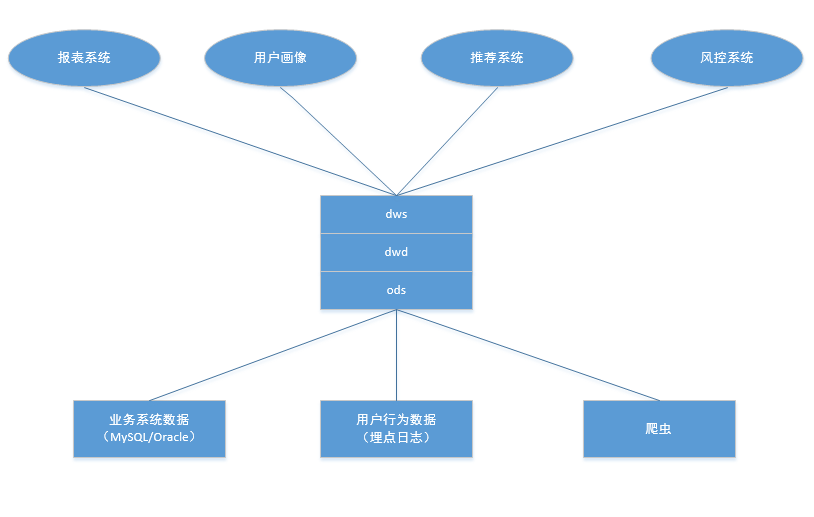 数据仓库中数据的用途主要有:报表系统、用户画像、推荐系统、风控系统、机器学习等,下面是数仓系统的整体架构图。