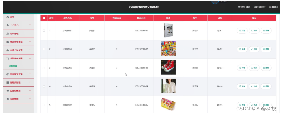 求购信息管理,在求购信息管理页面可以对索引、求购名称、类型、预算价格、联系电话、图片、账号、姓名等信息进行详情,修改或删除等操作,如图5-10所示。