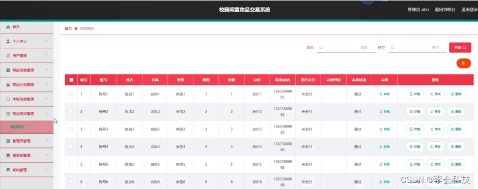 商品购买管理,在商品购买管理页面可以对索引、账号、姓名、名称、类型、数量、价格、总价、联系电话、是否支付、审核回复、审核状态、审核等信息进行详情,修改或删除等操作,如图5-11所示。