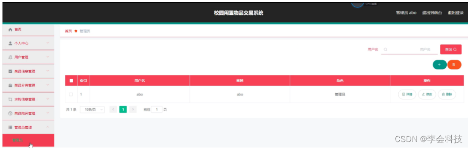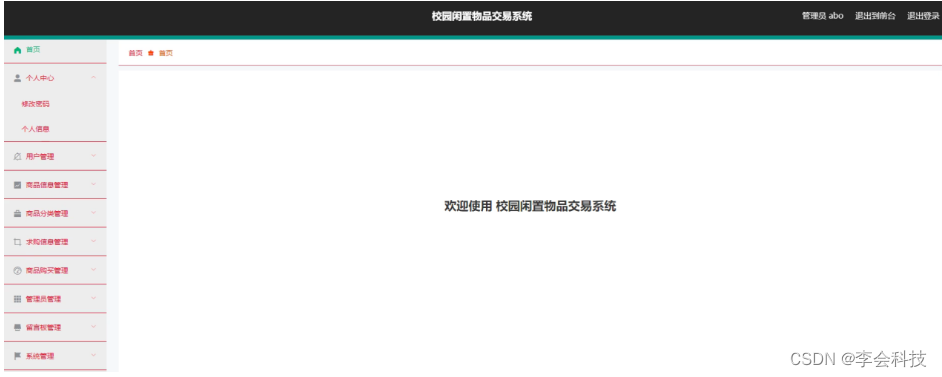 管理员登录进入校园闲置物品交易系统可以查看首页、个人中心、用户管理、商品信息管理、商品分类管理、求购信息管理、商品购买管理、管理员管理、留言板管理、系统管理等信息进行详细操作,如图5-7所示。