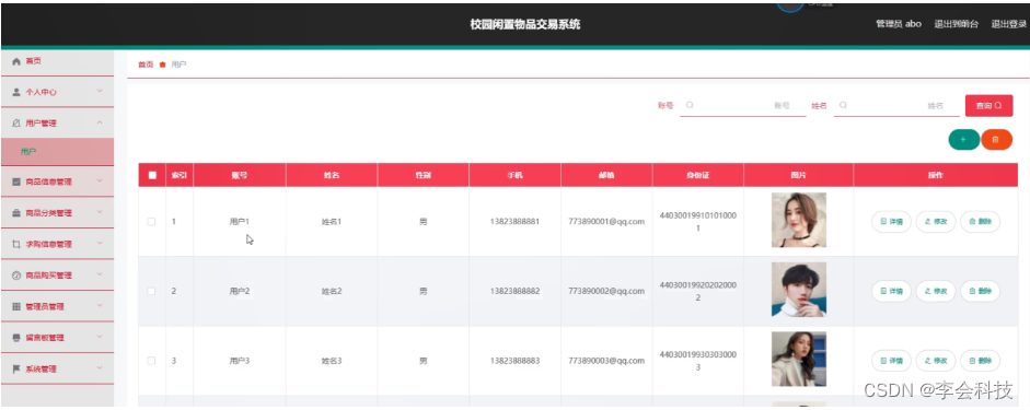 用户管理,在用户管理页面可以对索引、账号、姓名、性别、手机、邮箱、身份证、图片等信息进行详情,修改或删除等操作,如图5-8所示。