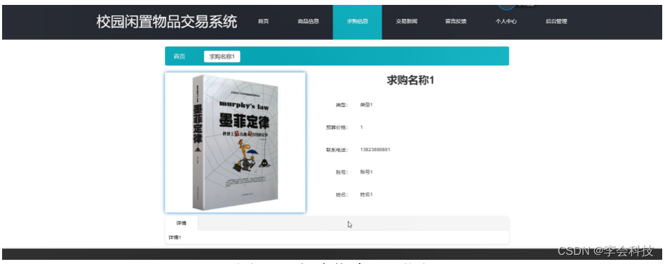 求购信息,在求购信息页面可以查看求购名称、类型、图片、预算价格、联系电话、账号、姓名、详情等详细信息,如图5-3所示。