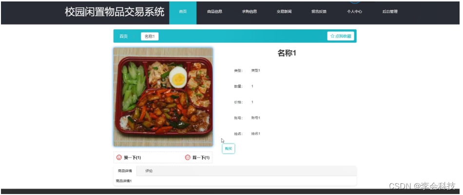 商品信息,在商品信息页面可以查看商品名称、类型、图片、数量、价格、账号、姓名、商品详情等详细内容进行购买、评论或收藏,如图5-2所示。