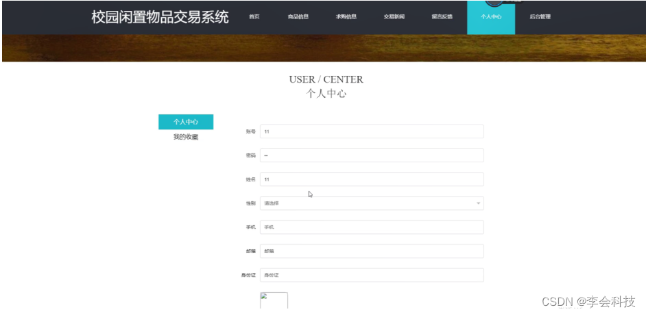 用户注册,在用户注册页面通过填写用户名、姓名、密码、手机、邮箱、身份证等信息完成用户注册,如图5-4所示。在个人中心页面通过填写账号、密码、姓名、性别、手机、邮箱、身份证、图片等信息进行个人信息更新操作,还可以根据需要对我的收藏进行详细操作;如图5-5所示。