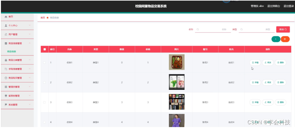 商品信息管理,在商品信息管理页面可以对索引、名称、类型、数量、价格、图片、账号、姓名等信息进行详情,修改或删除等操作,如图5-9所示。