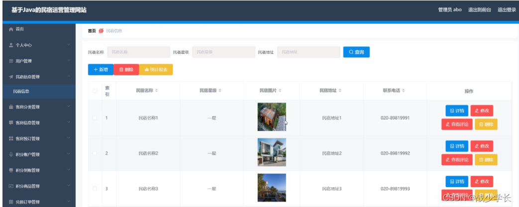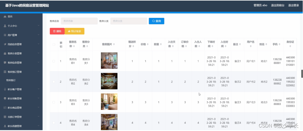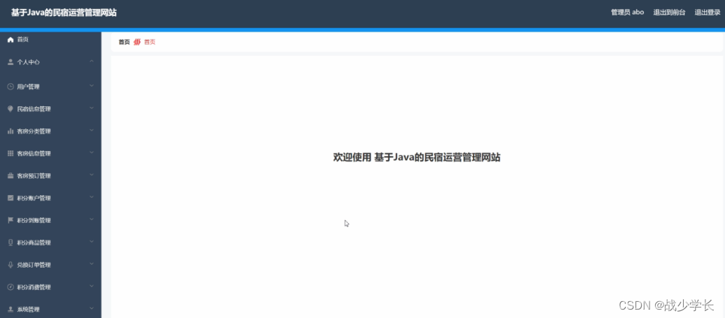 管理员登录进入系统可以查看首页、个人中心、用户管理、民宿信息管理、客房分类管理、客房信息管理、客房预订管理、积分账户管理、积分到账管理、积分商品管理、兑换订单管理、积分消费管理、系统管理等信息进行详细操作,如图5-8所示。