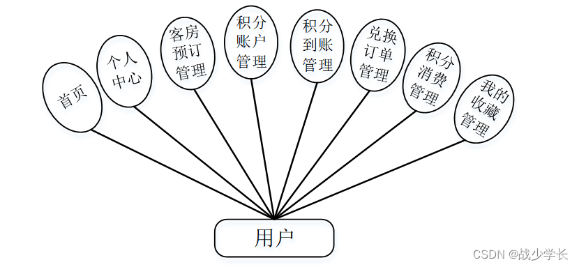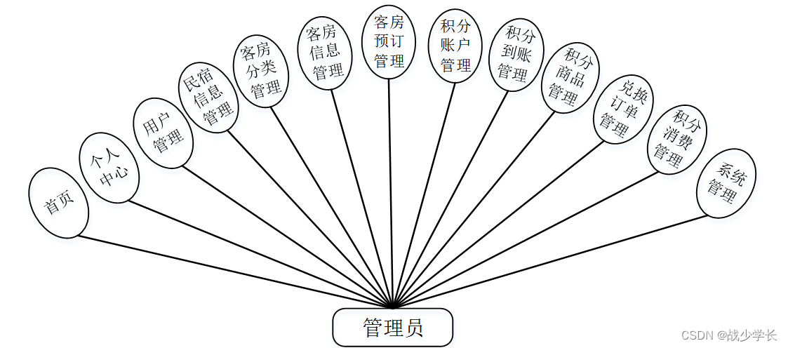 系统中的核心用户是系统管理员,管理员登录后,通过管理员菜单来管理后台系统。主要功能有:首页、个人中心、用户管理、民宿信息管理、客房分类管理、客房信息管理、客房预订管理、积分账户管理、积分到账管理、积分商品管理、兑换订单管理、积分消费管理、系统管理等功能。管理员用例如图3-7所示。