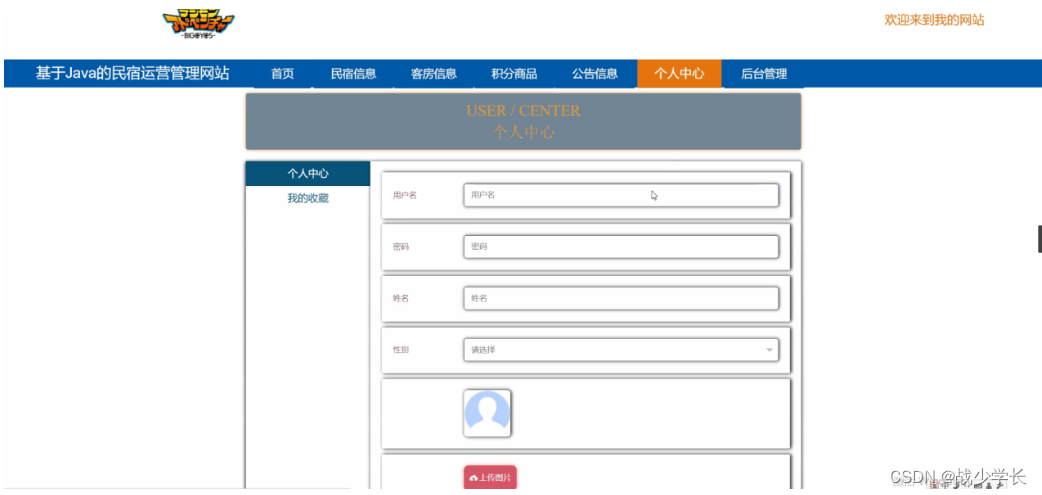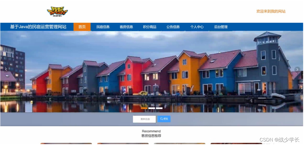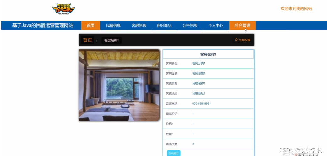 民宿运营管理网站,在系统首页可以查看首页、民宿信息、客房信息、积分商品、公告信息、个人中心、后台管理等内容进行详细操作,如图5-1所示。