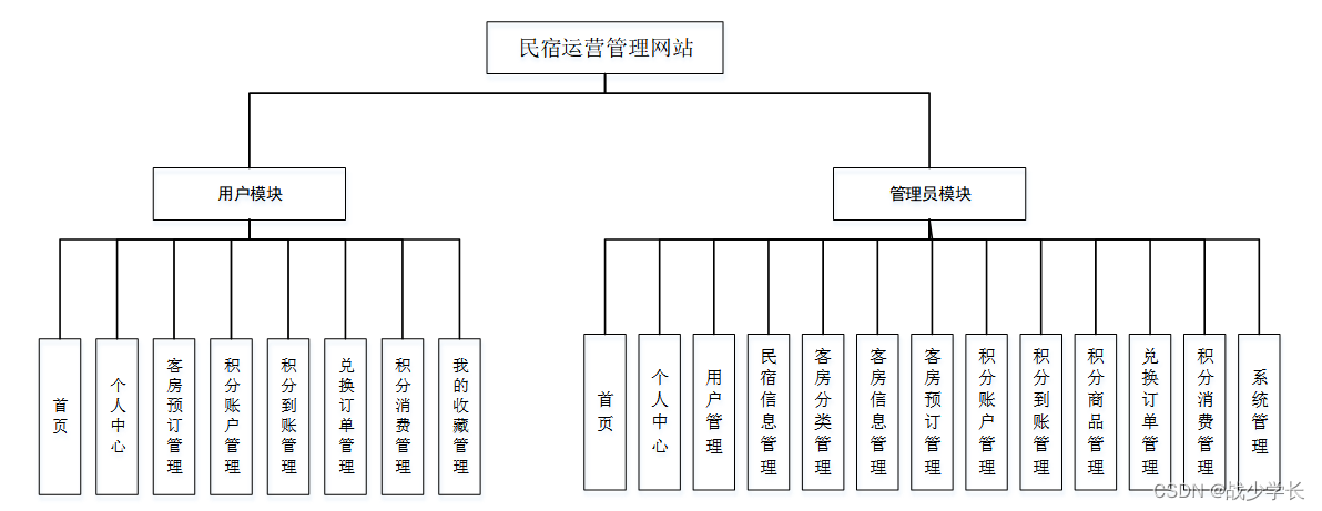 系统架构图属于系统设计阶段,系统架构图只是这个阶段一个产物,系统的总体架构决定了整个系统的模式,是系统的基础。民宿运营管理网站的整体结构设计如图4-2所示。