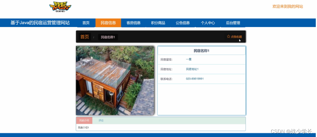 民宿信息,在民宿信息页面可以查看民宿名称、民宿星级、民宿地址、联系电话、民宿图片、民宿介绍等详细内容进行评论或收藏,如图5-2所示。
