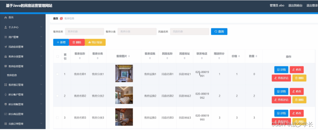 客房信息管理,在客房信息管理页面中可以查看索引、客房名称、客房分类、客房图片、客房设施、民宿名称、民宿地址、联系电话、赠送积分、价格、数量等信息,并可根据需要进行详情、修改、查看评论或删除等操作,如图5-11所示。