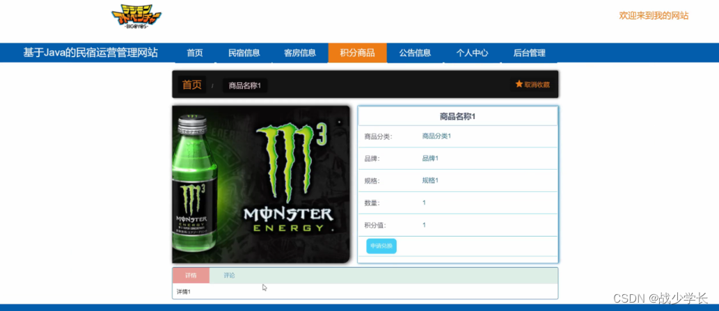 积分商品,在积分商品页面可以查看商品名称、商品分类、品牌、图片、规格、数量、积分值、详情等详细内容进行申请兑换,评论或收藏,如图5-4所示。
