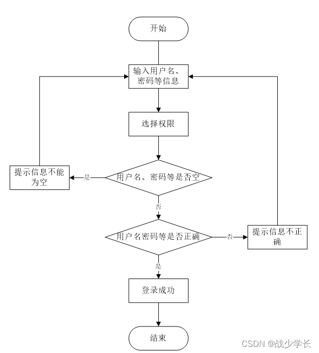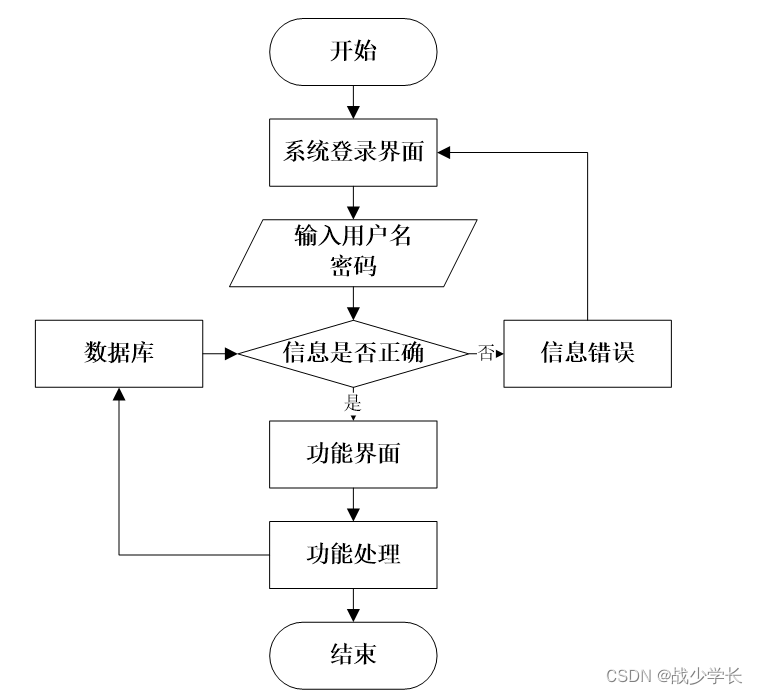 用户打开并进入系统后,会先显示登录界面,输入正确的用户名和密码,系统自动检测信息,若信息无误,则用户会进入系统功能界面,进行操作,否则会提示错误无法登录,操作流程如图3-3所示。