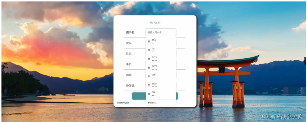 用户注册,在用户注册页面通过填写用户名、密码、姓名、手机、邮箱、身份证等信息完成用户注册,如图5-5所示。在个人中心页面通过填写用户名、密码、姓名、性别、图片、手机、邮箱、身份证等信息进行个人信息修改操作,还可以根据需要对我的收藏进行详细操作;如图5-6所示。