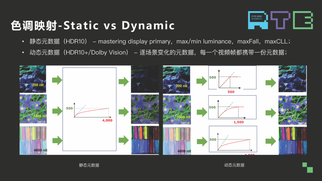 从上面这张图可以看出,动态元数据相比静态元数据,它在生成 tone mapping 曲线时更加灵活,它的每一帧都可以生成一条独立的 tone mapping 曲线,而静态元数据,整个文件所有帧都是共用一条 tone mapping 曲线。