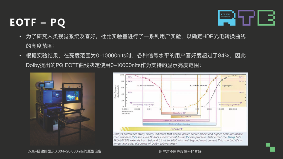 这个是杜比早前做过的一个实验,为了定义 PQ 光电曲线的亮度范围,各种信号水平用户喜好度 0-1 万比特,用户喜好度超过 84%,因此杜比在定义 PQ 这条光电曲线的时候,将峰值亮度定义到了 1 万。这部分利用了人眼的视觉特效模型定义了光电转换曲线的形状,我们发现紫色的线是人眼视觉特效模型 Barten ramp 阈值曲线,单比特光电转换曲线位于这条曲线斜坡之上时,说明转换出来的图像可能会有量化误差。位于阈值之下的时候,编码出来的图像会平滑。一个 12 比特的 Gama 峰值量都是 1000 比特和 12 比特 PQ,峰值量是 1 万和 1000 比特,它们的曲线在 Barten ramp 这条阈值曲线上是表示成这样。Gama 在 11 比特以下大部分处于曲线之上的,因此会出现量化误差,而 PQ 两条曲线和 Barten ramp 曲线形状比较一致,而且都处于 Barten ramp 曲线之下,所以它不会出现误差,而且不同亮度下位宽利用率比较好。