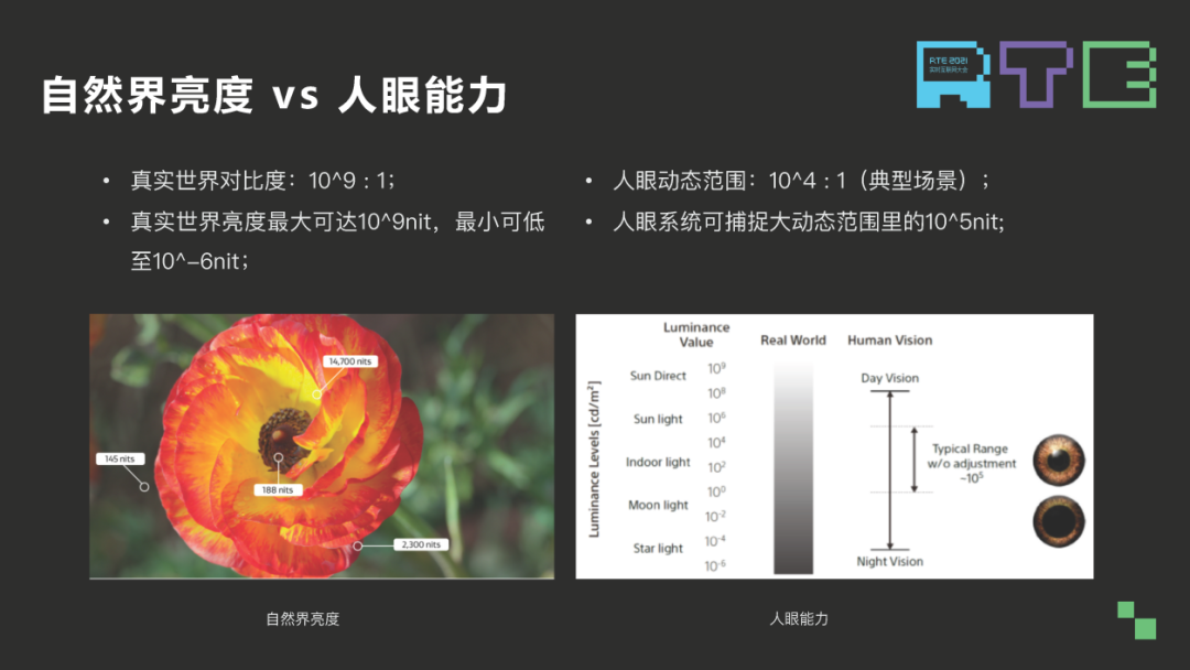 首先是亮度,自然界的亮度和对比度范围是挺大的,左边这个图一朵花里面最亮部分可以达到 14700nits,最暗的才 188nits,这个对比度能到大概 7000:1 的样子。但人眼能接收的亮度是有限的,过于暗的光线会导致人眼看不清物体,同时,人眼还有个特性,在不同的环境光亮度下,人眼是可以自动地调整它的瞳孔大小,以便更好的观察物体。新的 HDR 标准在定义的时候就很好地利用了人眼的这些视觉特性。