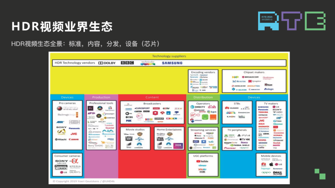 上图是一个生态全景图,对于整个生态来讲包含很多厂商,我们的认知生态是以 HDR 视频标准为基础,以前面的内容生产流程为纽带,将各个厂商聚合到一起,共同创造出来 HDR 视频的消费市场。我们比较关心的是流媒体生态,包括内容生产,分发,以及芯片和设备厂商。
