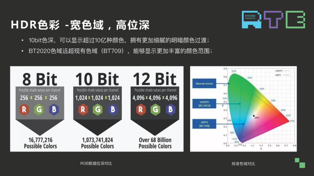 其次是色彩,10bit 编码颜色种类更多,更宽色域能显示的颜色则更多,右边 2020 色域相比 709 大很多,尤其是绿色区域,能显示更多绿色。
