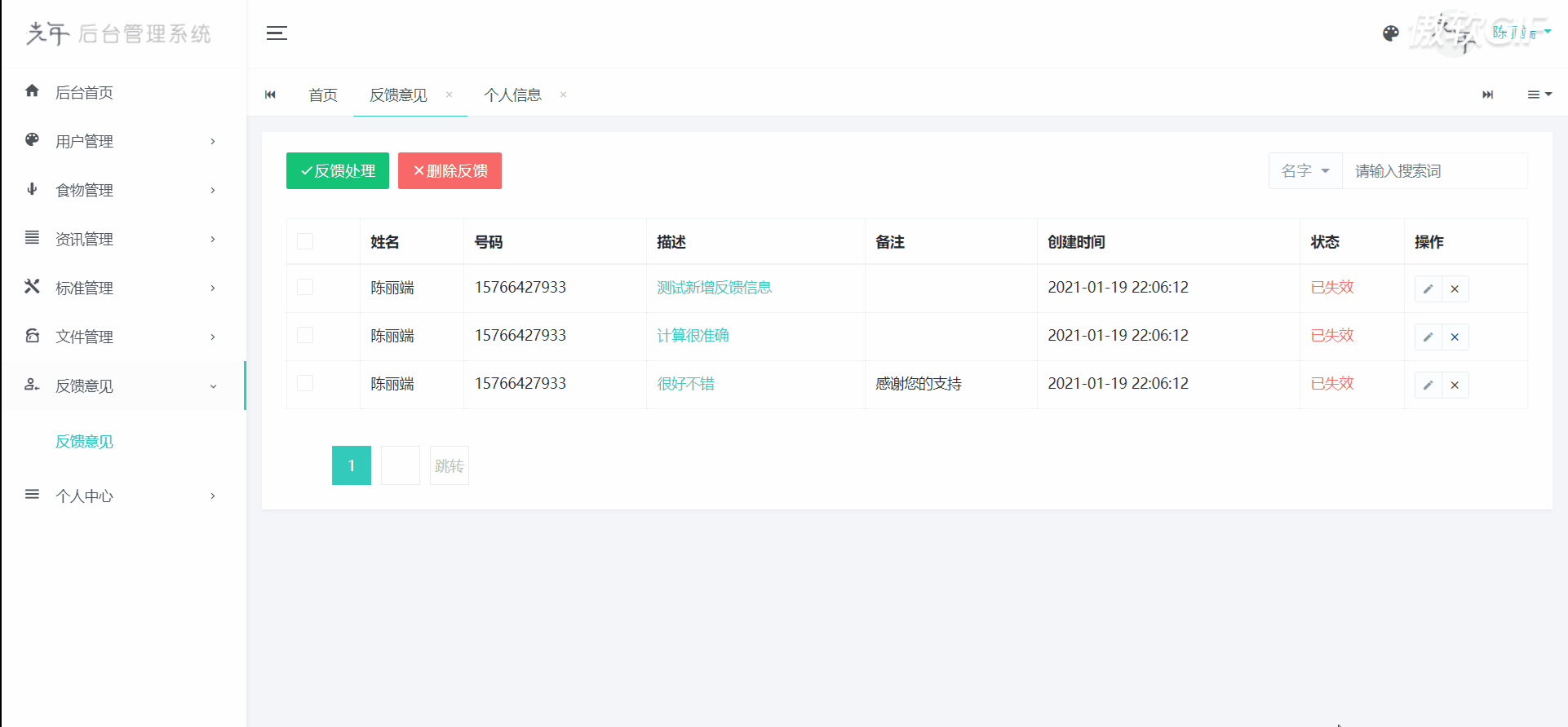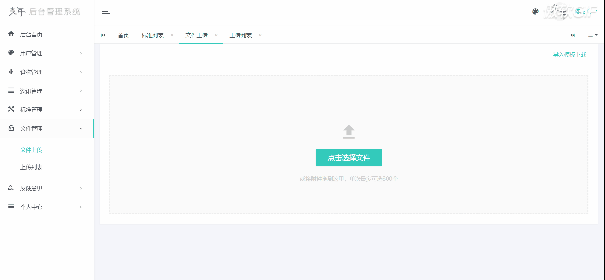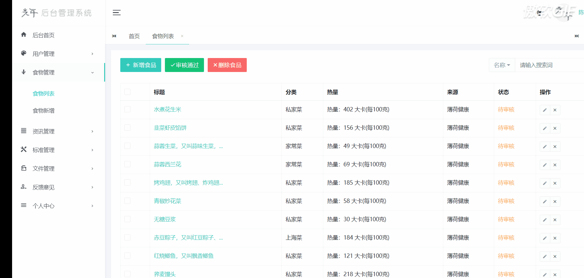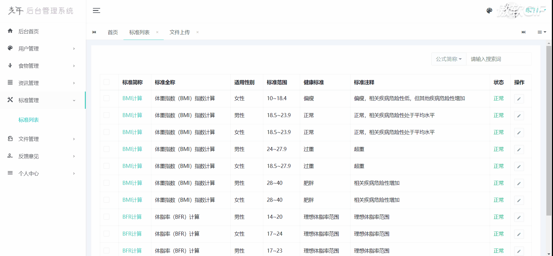 管理系统一共分为以下几个模块:用户登录、后台首页、用户管理、食物管理、资讯管理、标准管理、文件管理、反馈意见、个人中心、退出登录。