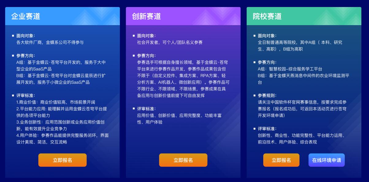 和往届不同的是,本届开发大赛分为企业赛道、创新赛道和院校赛道三个赛道,企业赛道面向 大型及中型企业和小微企业,鼓励参赛企业充分发挥苍穹平台核心能力,开发出服务于企业的 SaaS 产品。