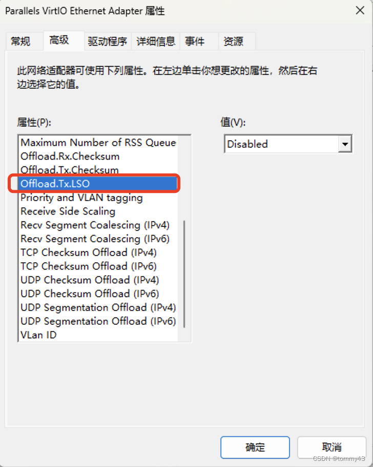 3、右键网卡,选择属性。在高级选项卡里选择Offload.Tx.LSO属性,调整值为Disabled。