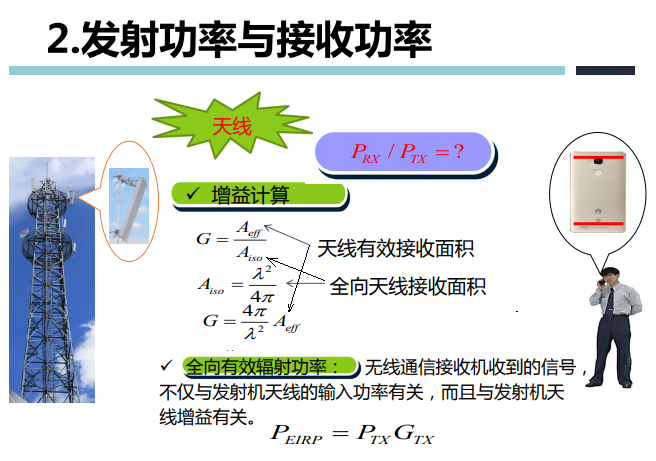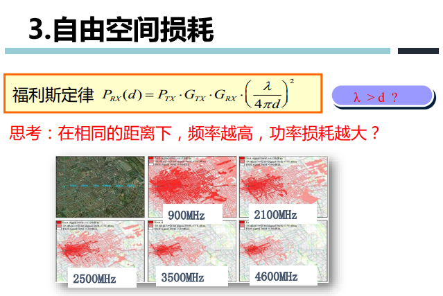 - 与波长的平方成正比。频率越高,波长越短,衰减越大,接收功率越小。