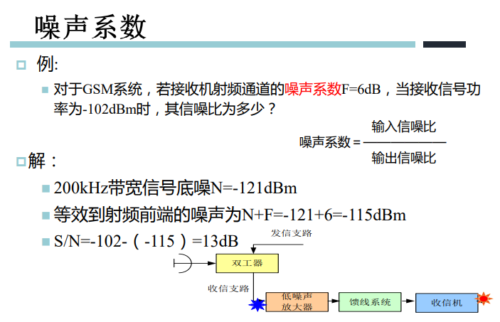 - 噪声系数NF=输入端信噪比/输出端信噪比,单位常用“dB”。