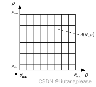 开始时,置数组A为零,然后对每一个图像空间中的给定点,让θ取遍区间上所有可能的值,并根据直线公式算出对应的ρ,再根据和的值(设都已经取整)对A累加:
