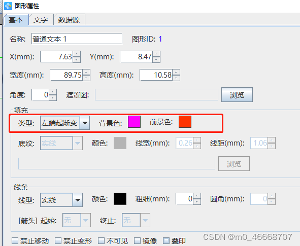双击打开图形属性界面,在“基本”界面,和上面的步骤一样,修改填充类型、前景色和背景色,点击确定。此时,可以看到文字字体的颜色发生了变化,成了渐变色(如下图)。
