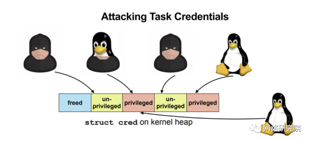 “DirtyCred 是一种内核利用概念,它将非特权内核凭证与特权凭证交换以提升特权,”研究人员林振鹏、吴宇航和邢新宇指出。“DirtyCred 没有覆盖内核堆上的任何关键数据字段,而是滥用堆内存重用机制来获得特权。”