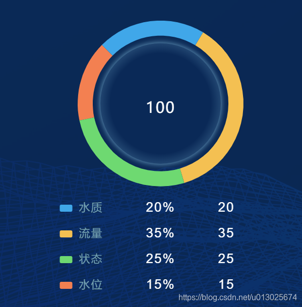 let data=[{value: 20,name: '水质',itemStyle:{normal: {color:'#40a7e9'}}}, {value: 35,name: '流量',itemStyle:{normal: {color:'#f4c052'}}}, {value: 25,name: '状态',itemStyle:{normal:{color: '#6ed971'}}}, {value: 15,name: '水位',itemStyle:{normal: {color:'#f38051'}}}]let option = {title: {text: '',},legend:{data:['水质','流量','状态','水位',],bottom:10,left:90,orient:'vertical',itemGap:25,formatter(name){let item=data.find(node=>node.name==name);return ['{title|'+item.name+'}{value|'+item.value+'%}{value|'+item.value+'}'].join('\n')},textStyle:{color:'#fff',fontSize:18,rich: {title: {color: '#73a1b0',align: 'left',fontSize:22,width:165,},value: {color: '#fff',align: 'left',fontSize:26,width:165,fontFamily:'Helvetica'},}}},series: [{z:10,type: 'pie',center:['50%', '35%'],radius: ['45%', '55%'],startAngle: 135,itemStyle : {normal : {label : {show : false},labelLine : {show : false}},},data:data},{ //内圆type: 'pie',center:['50%', '35%'],radius: '40%',itemStyle: {normal: {color: new echarts.graphic.RadialGradient(.5, .5, .8, [{offset: 0,color: '#0a2957'},{offset: .52,color: '#0a2957'},{offset: 1,color: '#71a8ca'}], false),shadowColor: '#71a8ca',shadowBlur: 12,label: {show:true,position:'center',textStyle: {color: '#fff',fontSize: 30,fontWeight:400,},},labelLine: {show: false}},},hoverAnimation: false,label: {show: true,},tooltip: {show: false},data: [{name:'100',value:0}],
