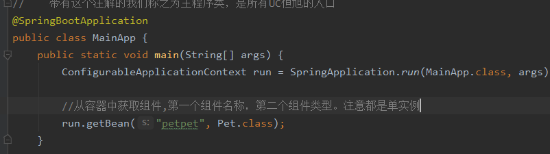 作用:声明这是一个配置类,在类中使用@Bean注解可以在方法上给容器注册组件,默认单实例,本身配置类也是一个组件。