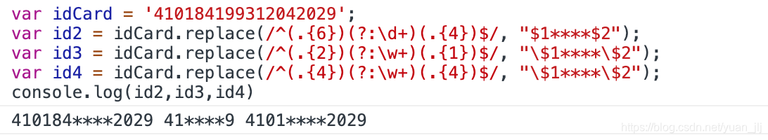 var id2 = idCard.replace(/^(.{6})(?:\d+)(.{4})$/, "$1****$2");