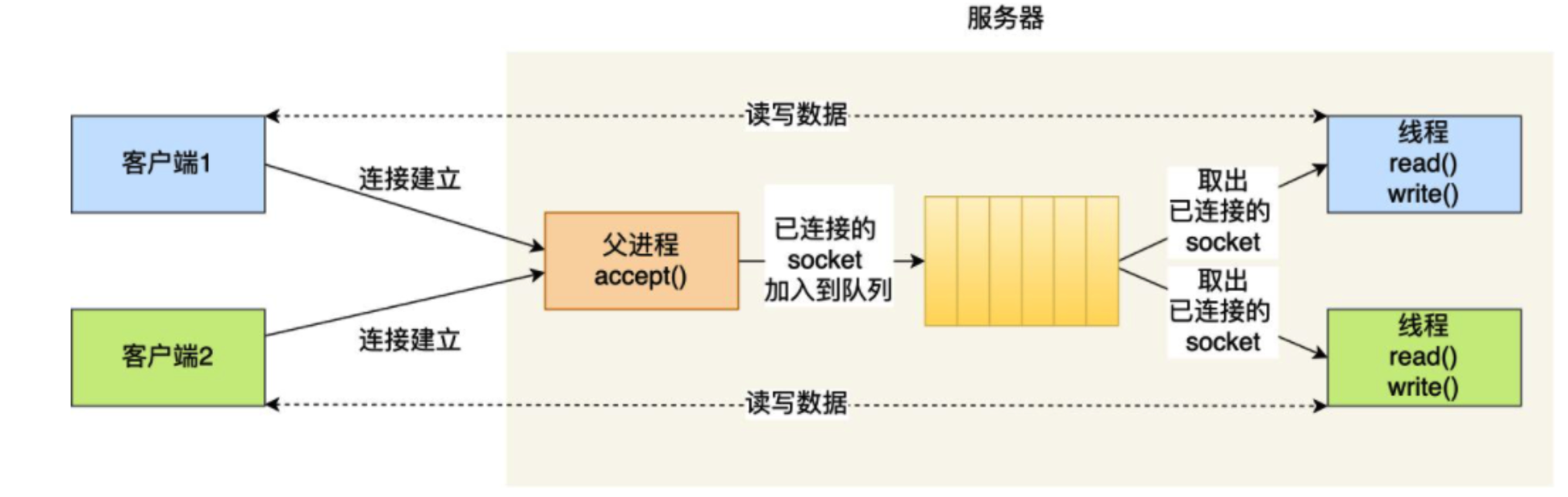 那么,我们可以使用线程池的方式来避免线程的频繁创建和销毁,所谓的线程池,就是提前创建若干个线程,这样当由新连接建立时,将这个已连接的 Socket 放入到一个队列里,然后线程池里的线程负责从队列中取出已连接 Socket 进程处理。