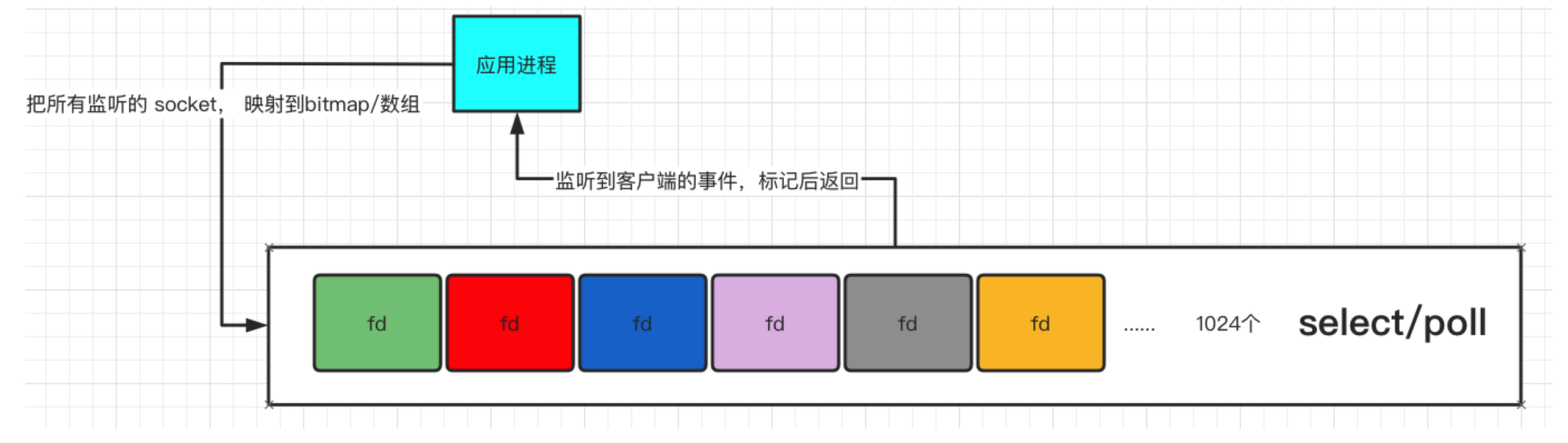 select 实现多路复用的方式是,将已连接的 Socket 都放到一个文件描述符集合,然后调用 select 函数将文件描述符集合拷贝到内核里,让内核来检查是否有网络事件产生,检查的方式很粗暴,就是通过遍历文件描述符集合的方式,当检查到有事件产生后,将此 Socket 标记为可读或可写, 接着再把整个文件描述符集合拷贝回用户态里,然后用户态还需要再通过遍历的方法找到可读或可写的 Socket,然后再对其处理。
