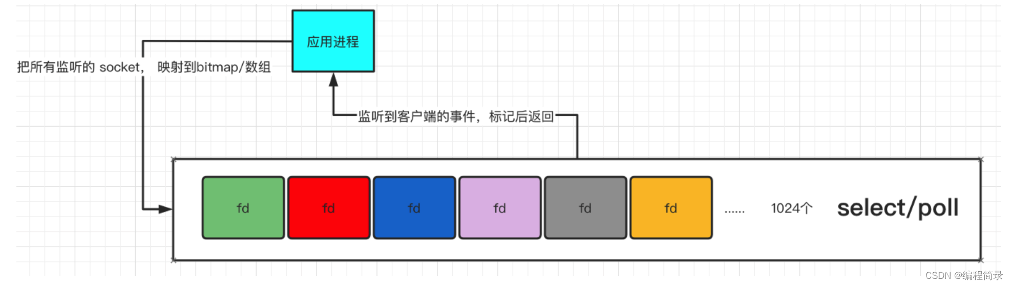 &rset= //根据fds数组构建出的 bitmap;//读监听while(1){// bitmap 位置零FD_ZERO(&rset);for(i =0:i<20;i++){// 遍历集合,将对应的编号改为 1FD_SET(fds[i],&rset);}// 内核提供的封装,拷贝-> 标记 -> 拷贝select(max+1,&rset,NULL,NULL,NULL);for(i=0; i<20;i++){if(FD_ISSET(fds[i], &rset)){memset(buffer,0,MAXBUF);read(fds[i],buffer, MAXBUF);}}