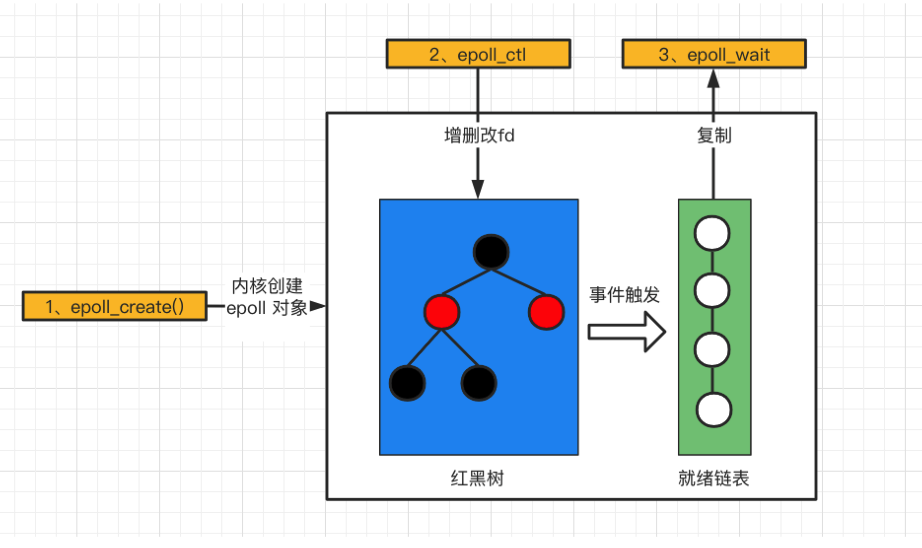 第二点, epoll 使用事件驱动的机制,内核里维护了一个链表来记录就绪事件,当某个 socket 有事件发生时,通过回调函数内核会将其加入到这个就绪事件列表中,当用户调用 epoll_wait() 函数时,只会返回有事件发生的文件描述符的个数,不需要像 select/poll 那样轮询扫描整个 socket 集合,大大提高了检测的效率。