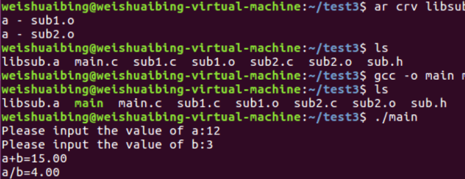 在删掉静态库的情况下,运行可执行文件,发现程序仍旧正常运行,表明静态库跟程序执行没有联系。同时,也表明静态库是在程序编译的时候被连接到代码中的。